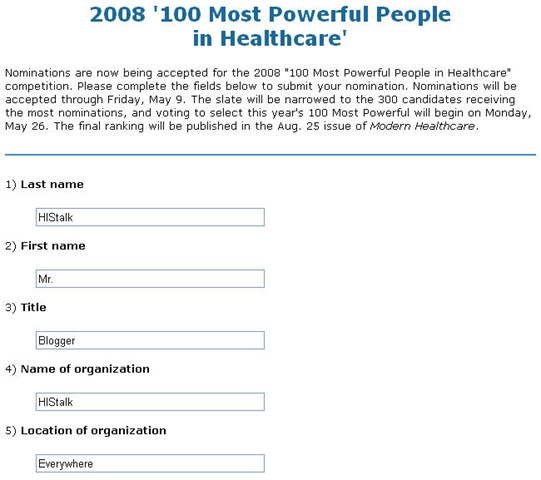Say, wouldn’t it be a hoot if some anonymous blowhard was named one of the 100 Most Powerful People in Healthcare? You can nominate me here (by Friday). I’m sure the magazine people will squelch it, but what the heck. I’ll even helpfully show you what to fill in so the votes can be tabulated before being discarded scornfully – click the pic. I’m thinking I shouldn’t reserve the tux quite yet.