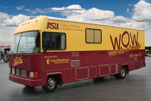 I like the new health care van belonging to ASU’s College of Nursing & Healthcare Innovation. A $700,000 UnitedHealthcare grant paid for the WOW-mobile (stands for Wellness on Wheels) that will bring primary care services to underserved Arizona communities. The rest of the grant money, by the way, will be used for pediatric obesity and child-teen mental health programs.